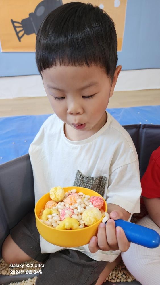 친구들하고 과자 풀장에서 과자로 반지, 팔찌도 만들고 과자가 가득 들었는 손가락풍선도 만들었어.