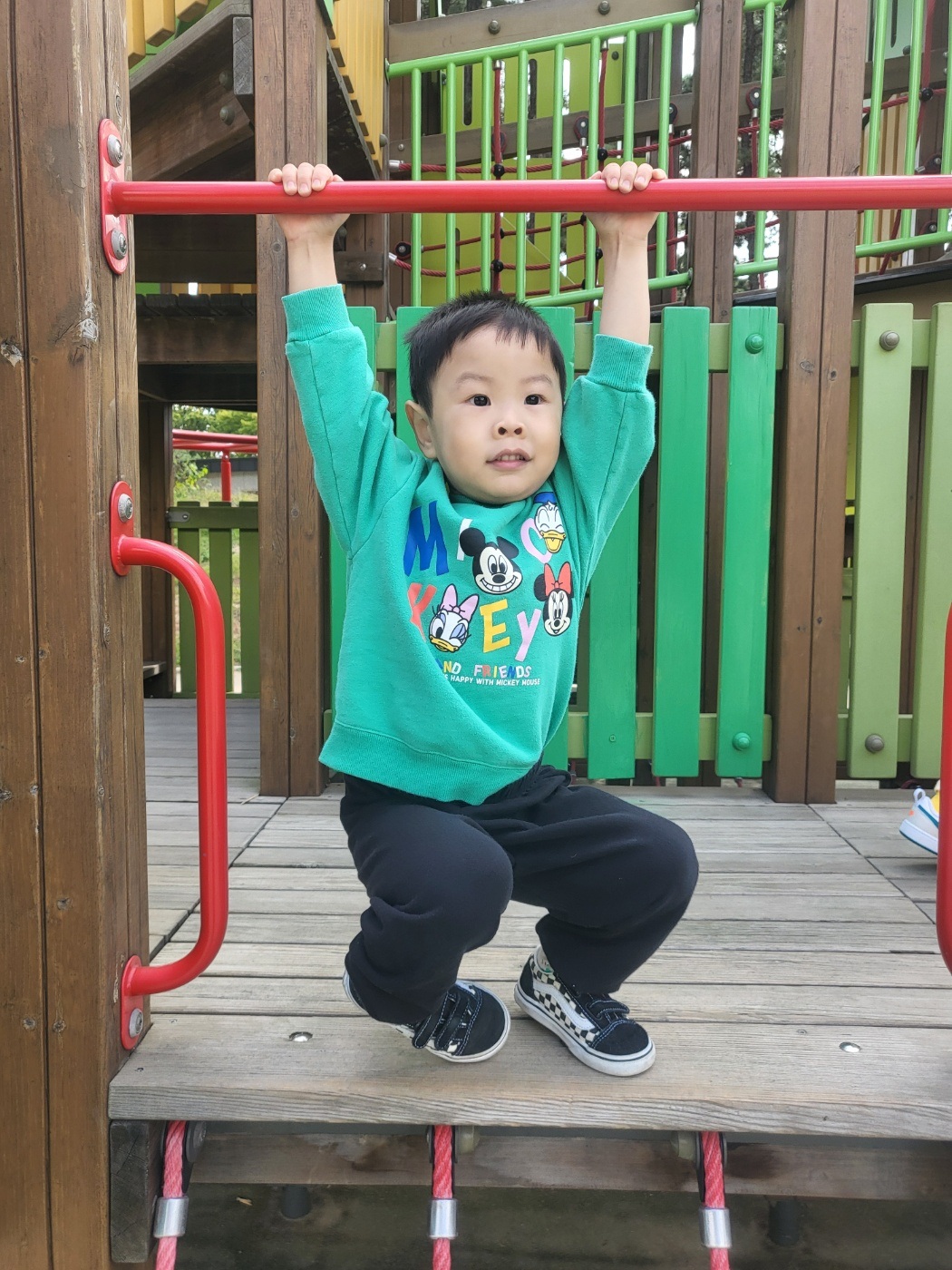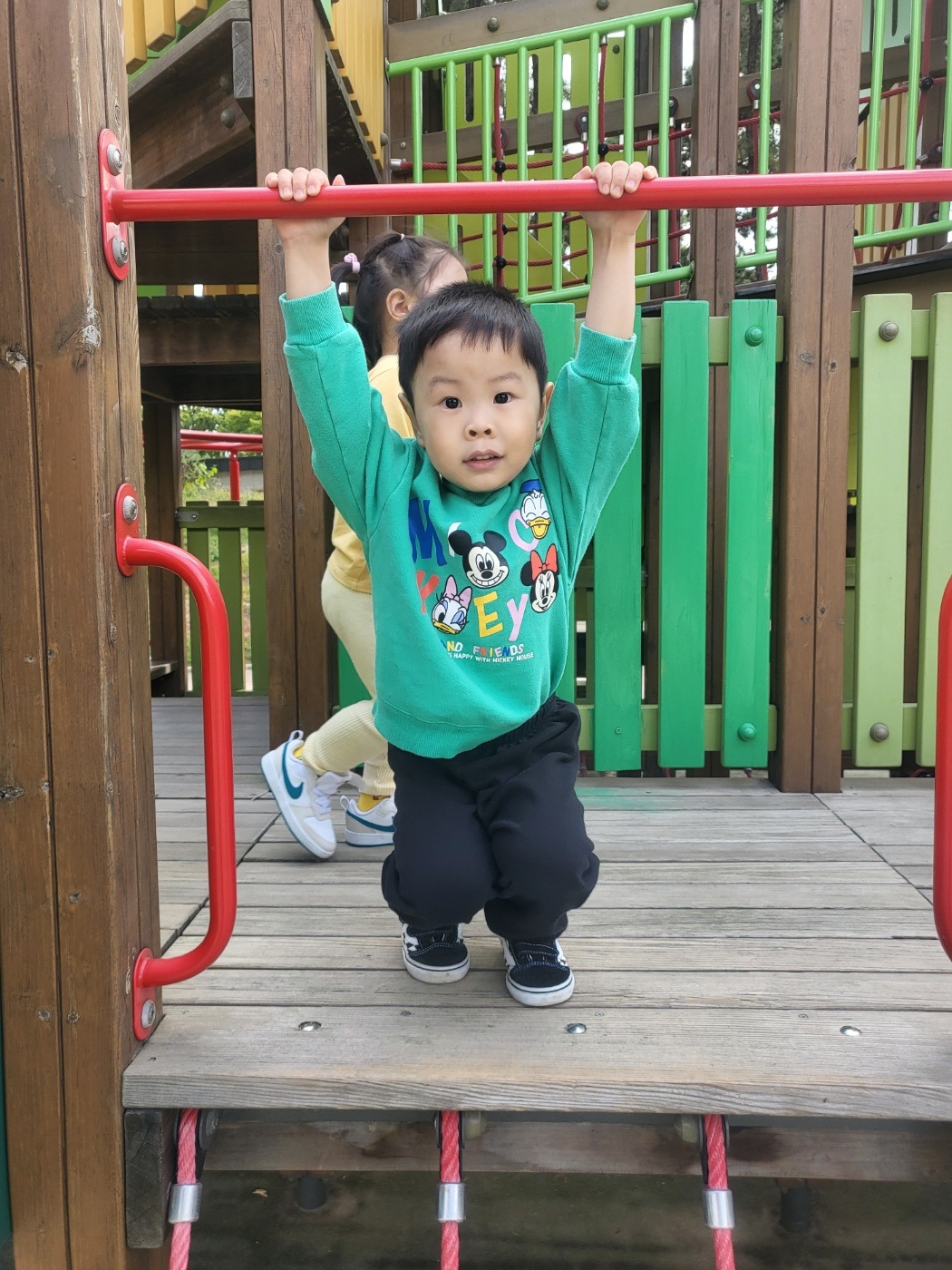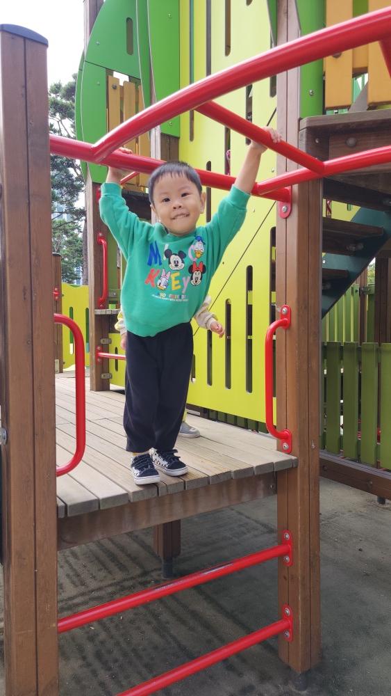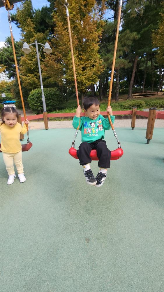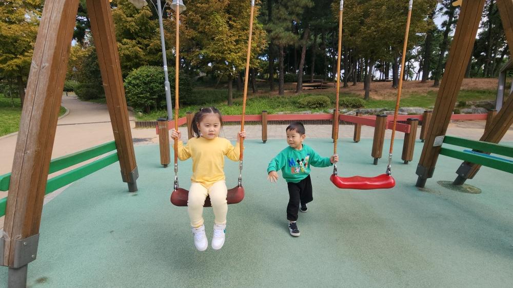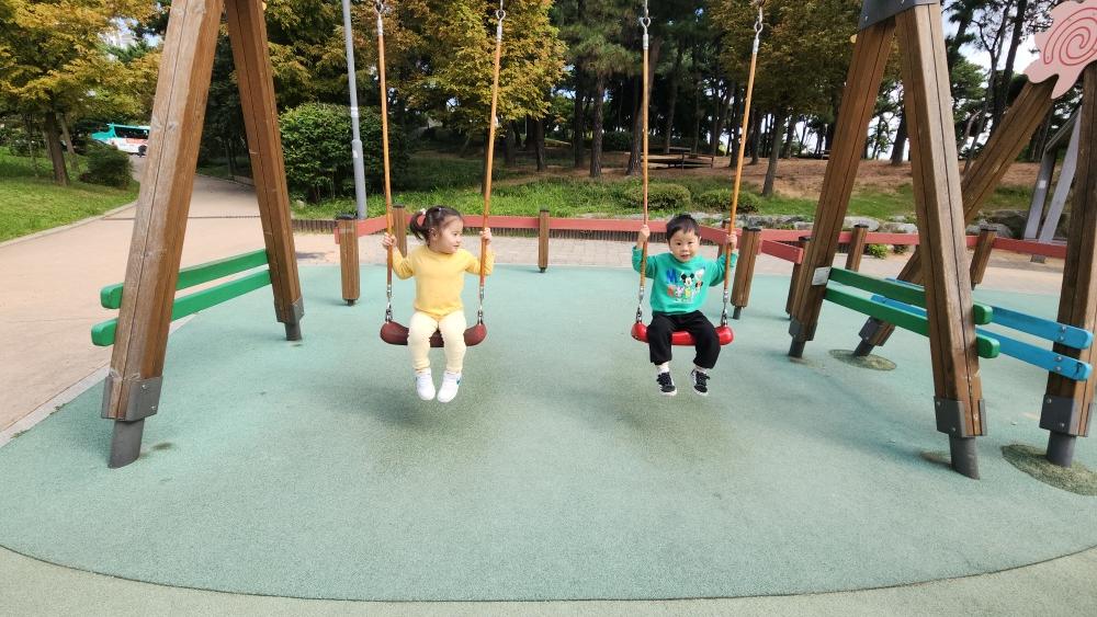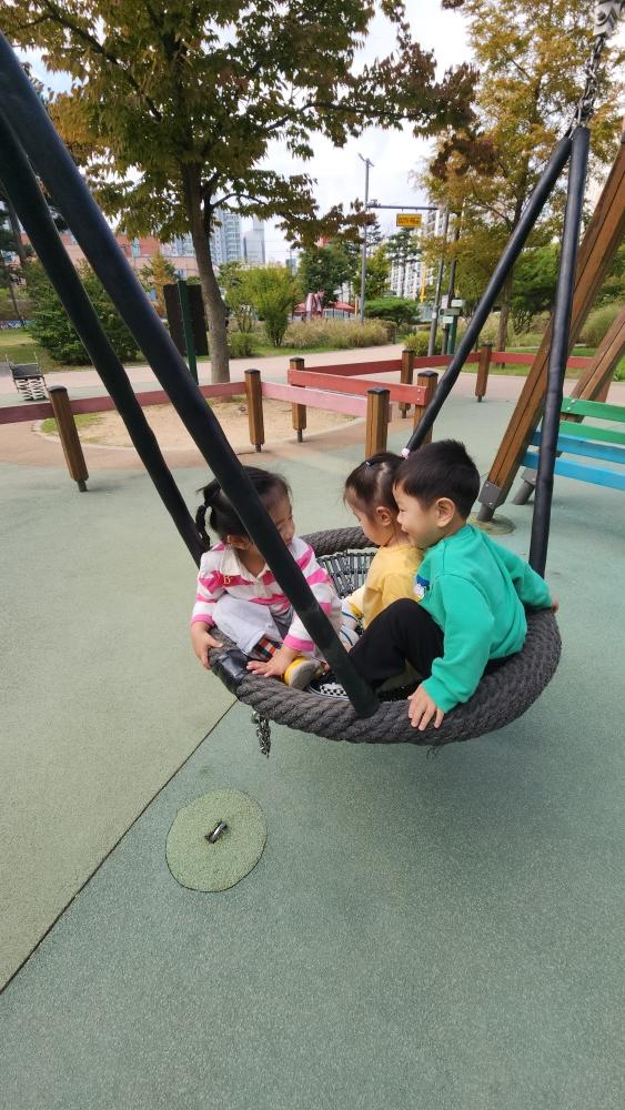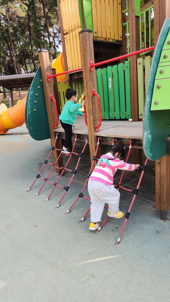 그네도 타고 미끄럼도 타고 구름다리도 건너고 재밌게 놀았어.