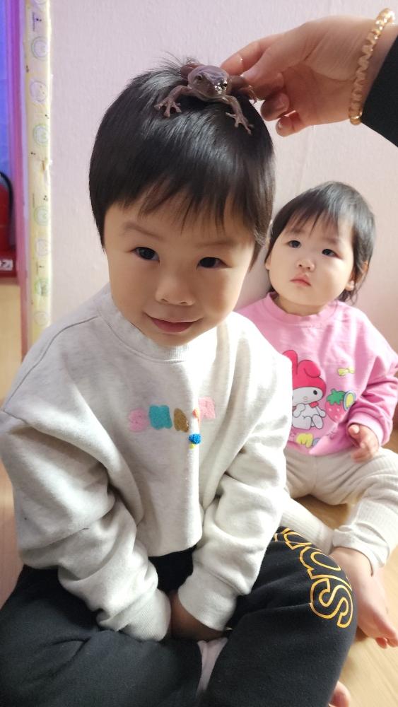 '화이트트릭프록'이라는 개구리도 만져보고  머리에 올려도 봤어.