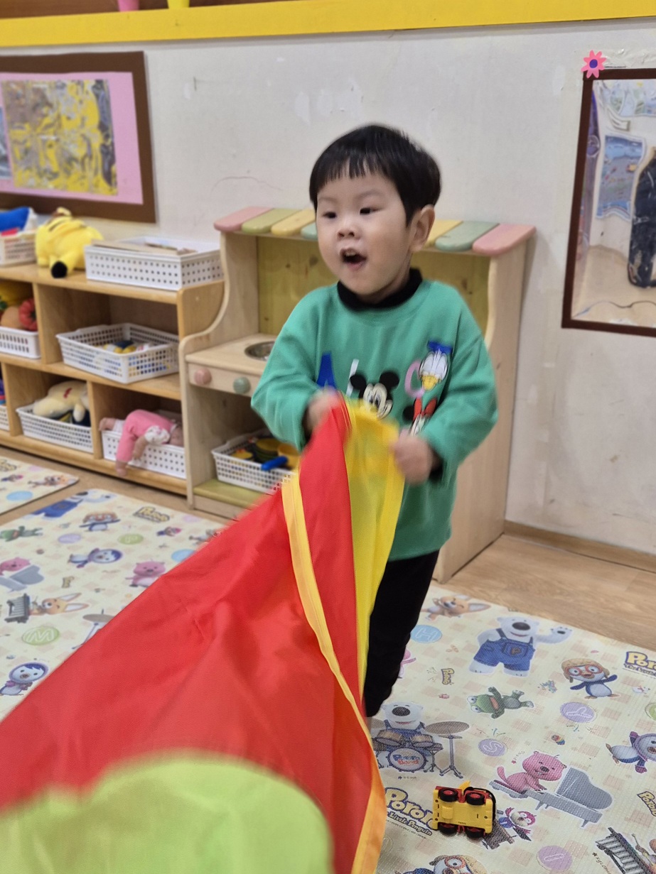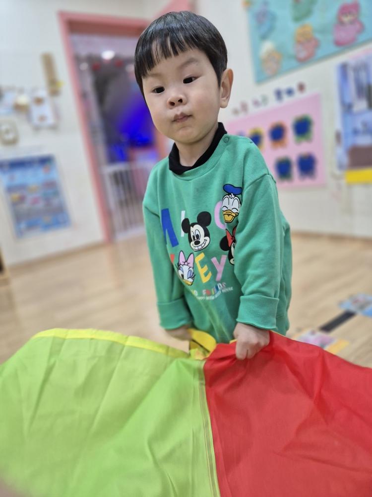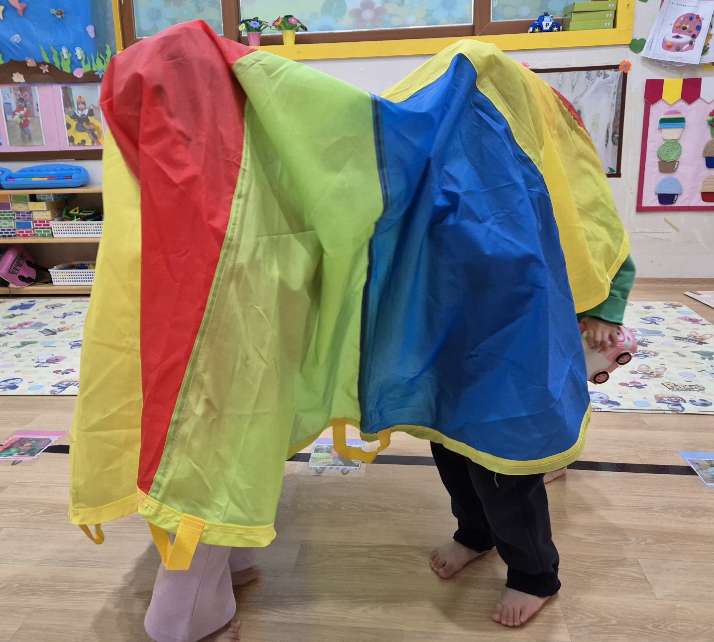 오늘 어린이 집에서 파라슈트를 가지고 놀았어.