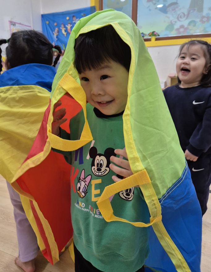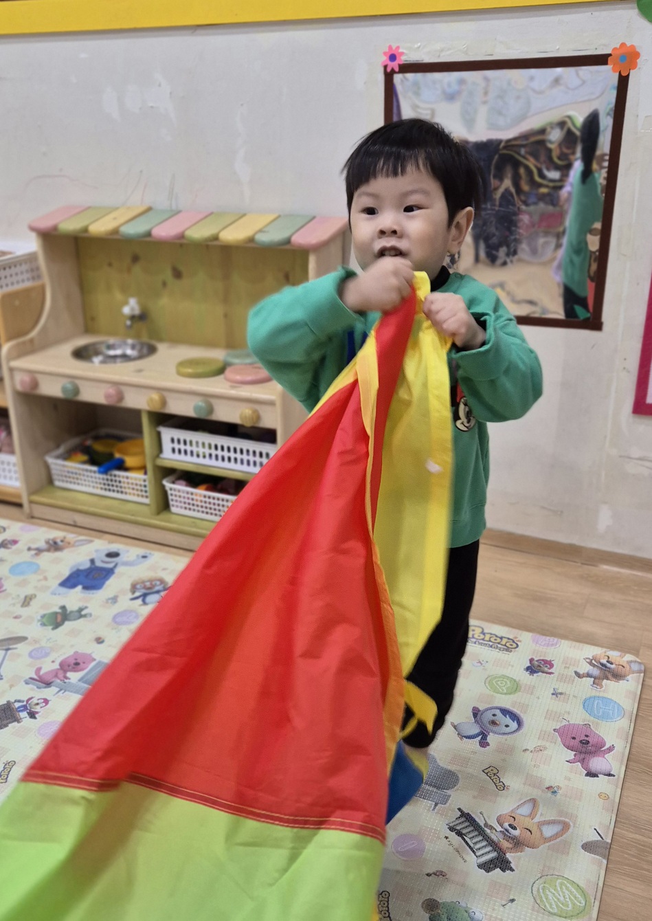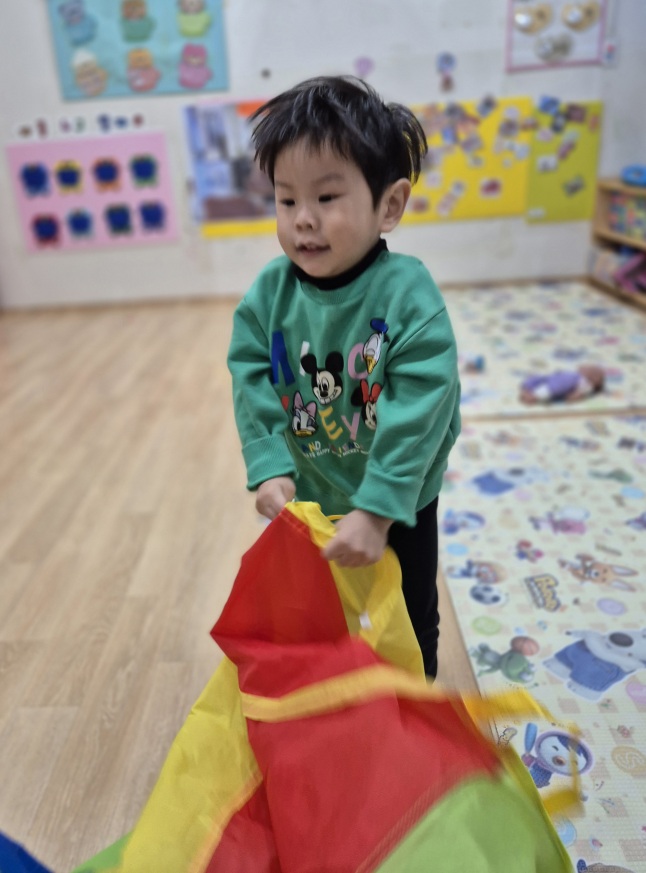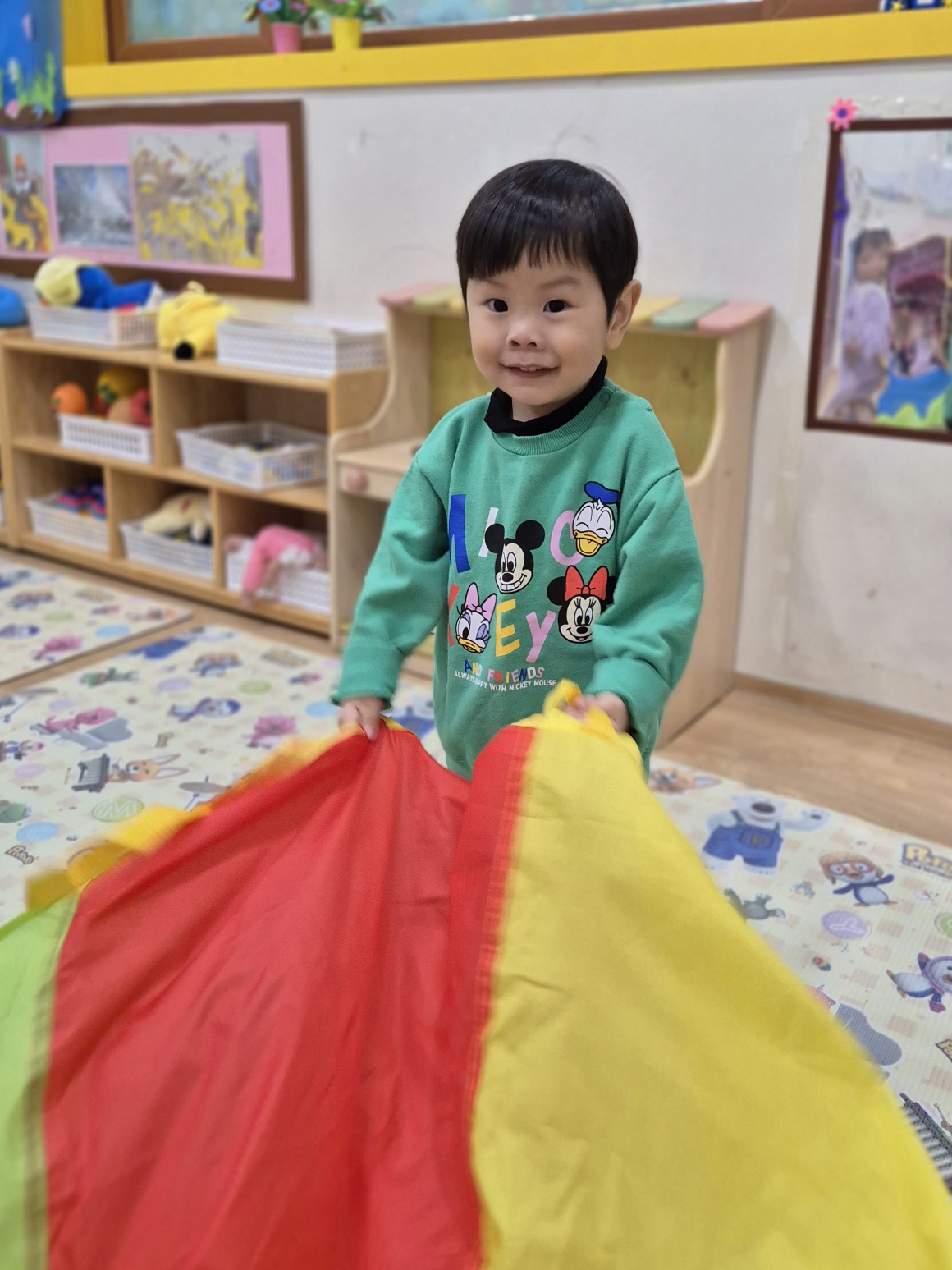 오늘 어린이 집에서 파라슈트를 가지고 놀았어.
