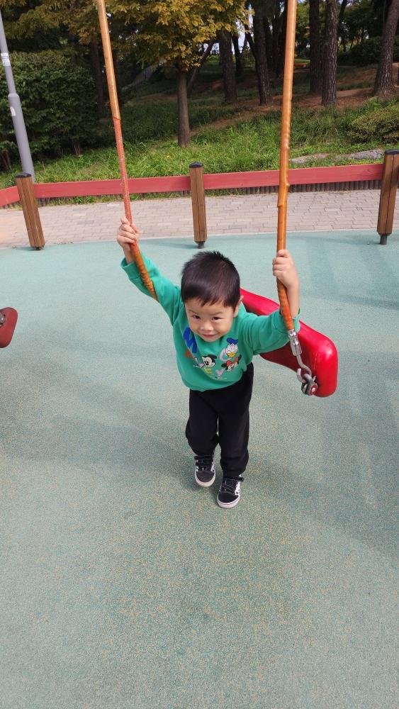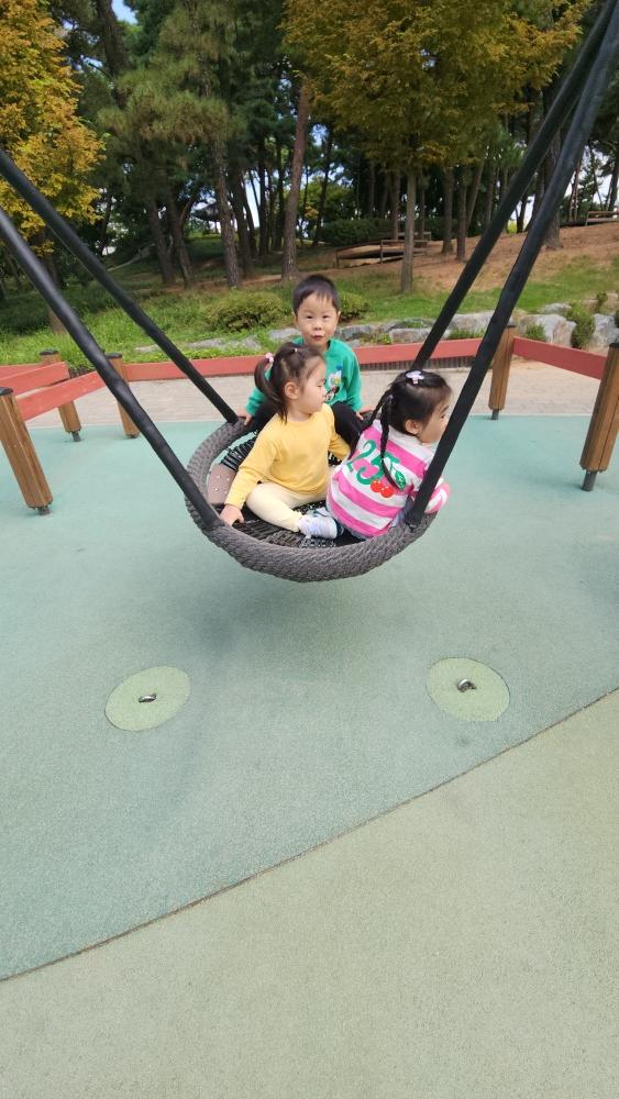 그네도 타고 미끄럼도 타고 구름다리도 건너고 재밌게 놀았어.