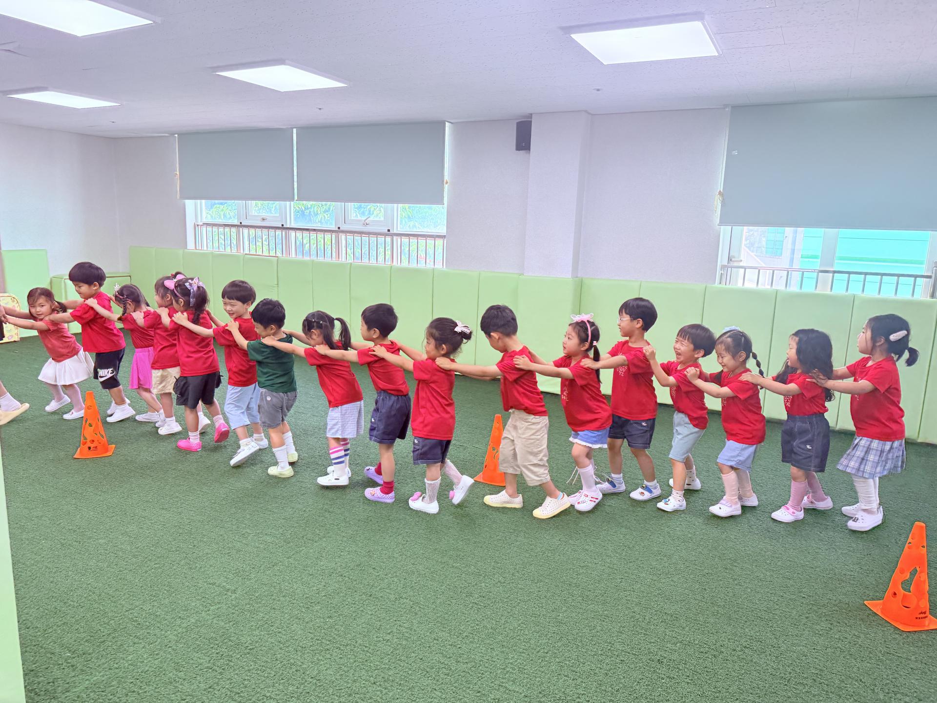 오늘 유치원에서는 어제 본 기차처럼 친구들과 어깨동무하고 기차가 되었어.