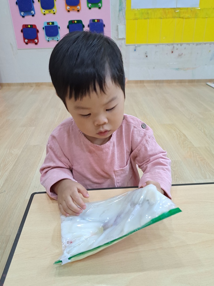 밀가루를 봉투 안에 넣고 촉감놀이 했어.