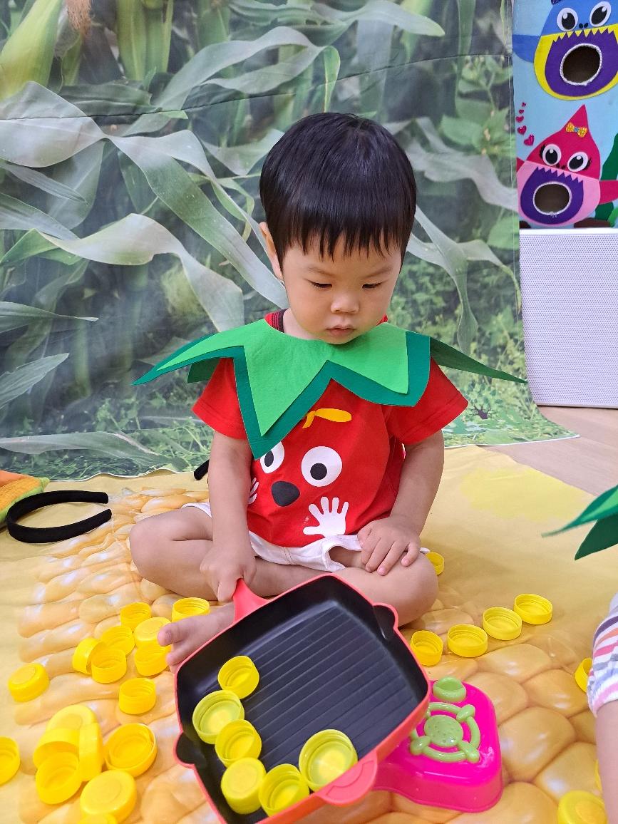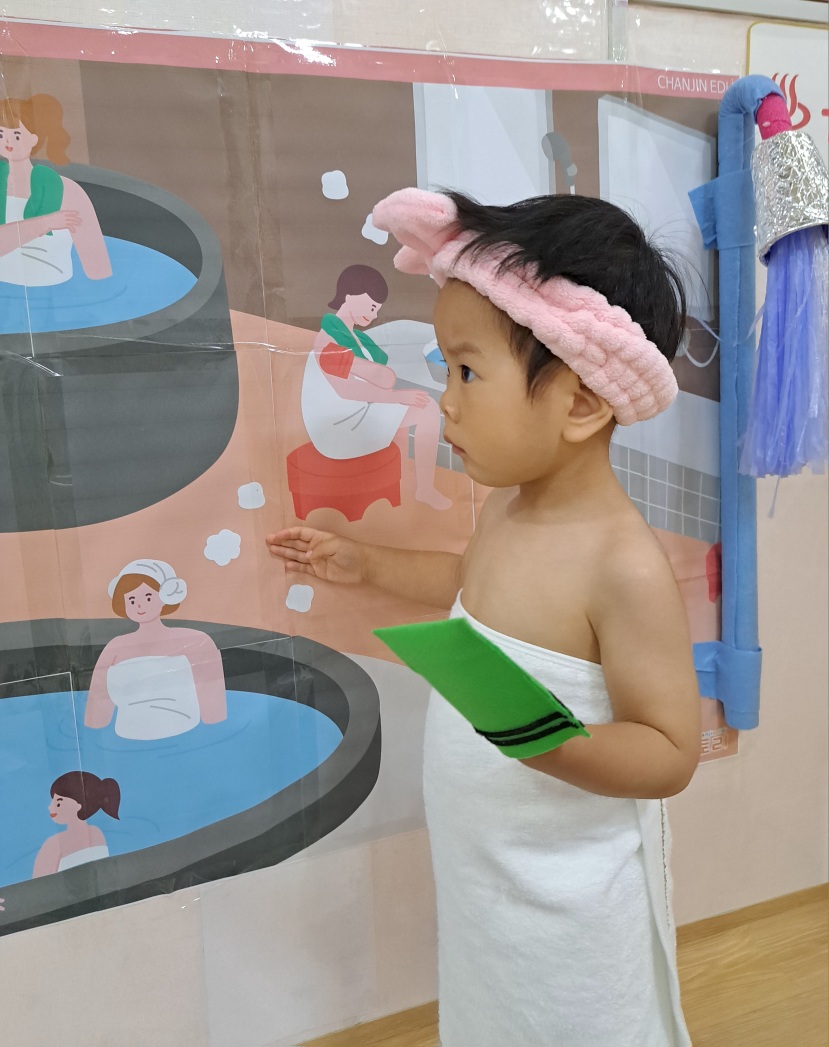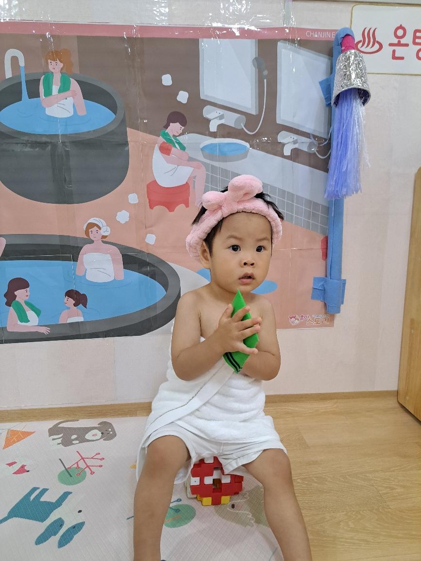 비가 와서 우비 입고 놀다가 집에서 간식 먹는 중.
